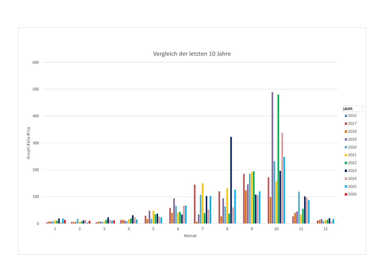 Durch Pilze verursachte Vergiftungen und Vergiftungsverdachtsfälle werden dem GIZ-Nord mit großer saisonaler Schwankung berichtet. Besonders viele Fälle gibt es jedes Jahr im Spätsommer und Herbst. Ein Vergleich der letzten 10 Jahre ist in folgender Grafik dargestellt.
